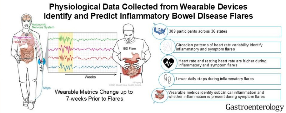 A study across 36 U.S. states found that wearable devices like Apple Watches, Fitbits, & Oura Rings can detect & predict inflammatory bowel disease (IBD) flares. Changes in heart rate, heart rate variability, steps, & oxygenation were seen up to 7 weeks before a flare. Circadian patterns in heart rate variability also differed between flare & remission periods.