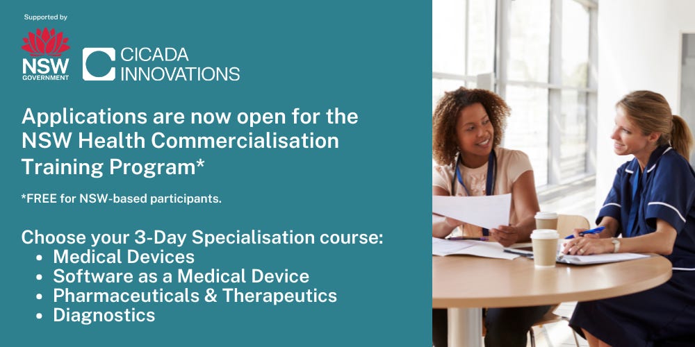 Want to learn how to commercialise tech, research or devices? 💰 What do you need to know to navigate and succeed in building healthtechs? The NSW Health Commercialisation Training Program is back for 2025!