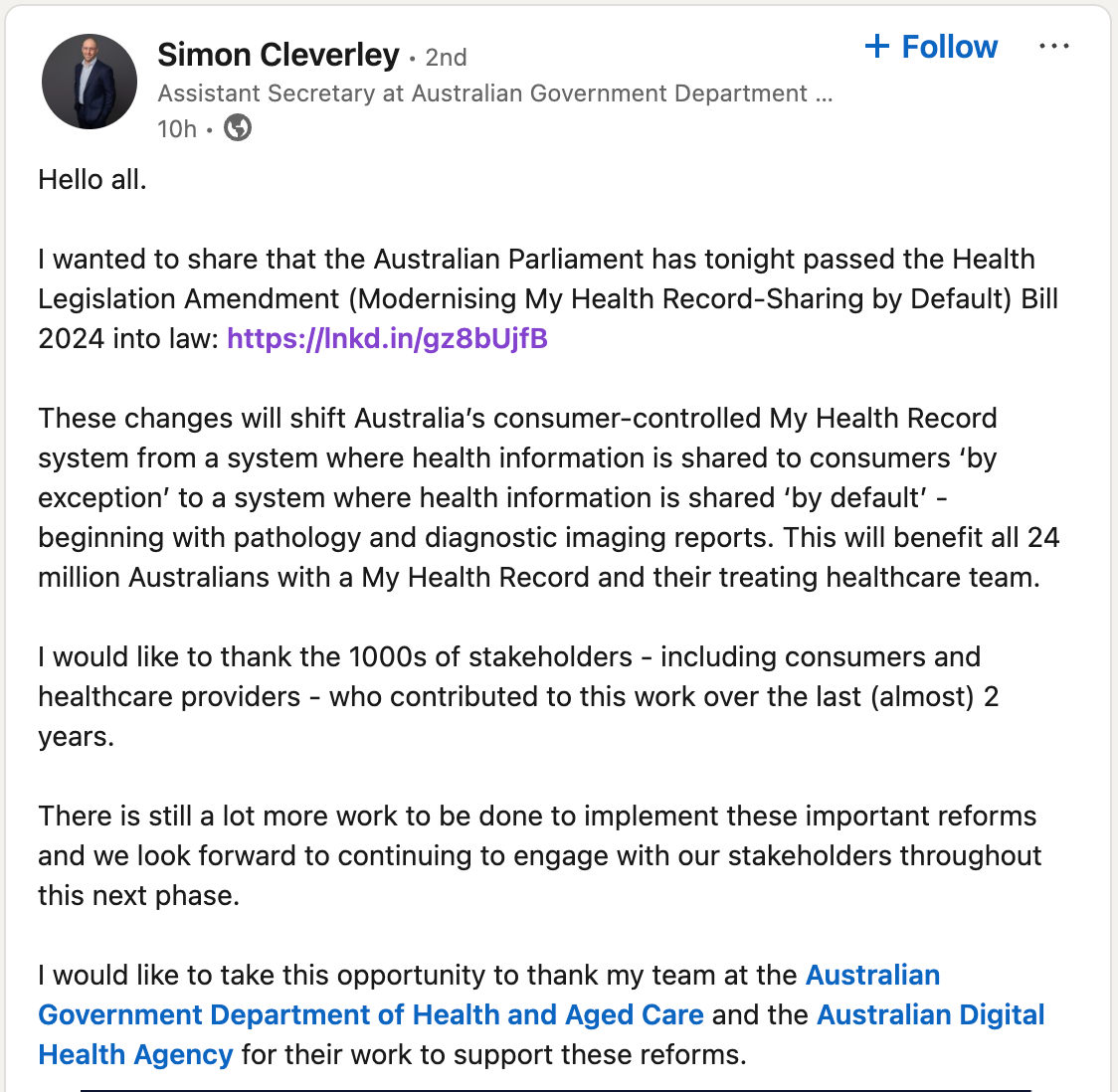 Last night, in what’s long over progress for Aussie healthcare and tech - Parialiament passed the Modernising My Health Record - Sharing by Default Bill. Meaning finally, all medical records will be shared to your supposed “universal online record”