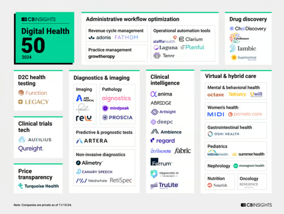 🏆 CB Insights announced the winners of the 2024 Digital Health 50 — a list of the world’s 50 most promising private digital health companies. 4 key themes emerged from this year’s cohort: