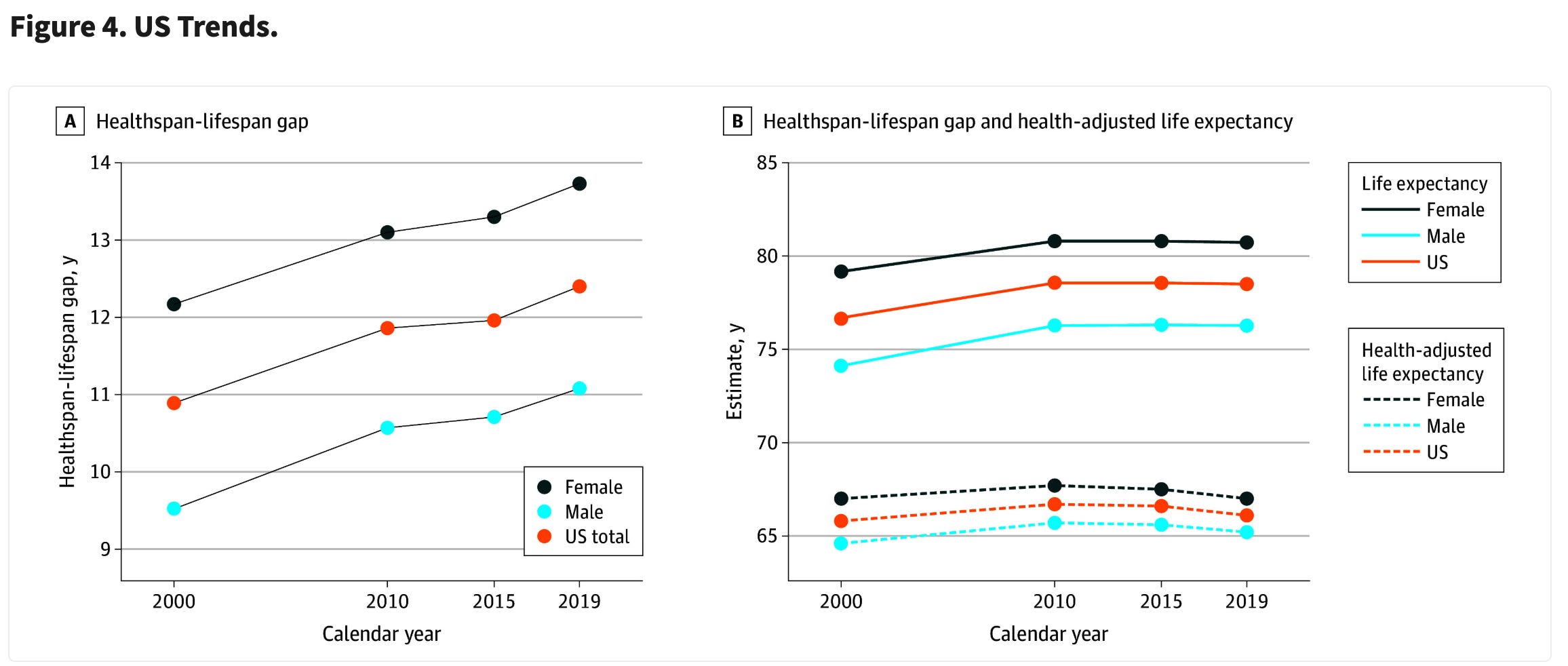 📊 Jama’s review of healthspan-lifespan gaps across 183 WHO member states reveals that the gap between total life expectancy and healthy years of life lived is increasing