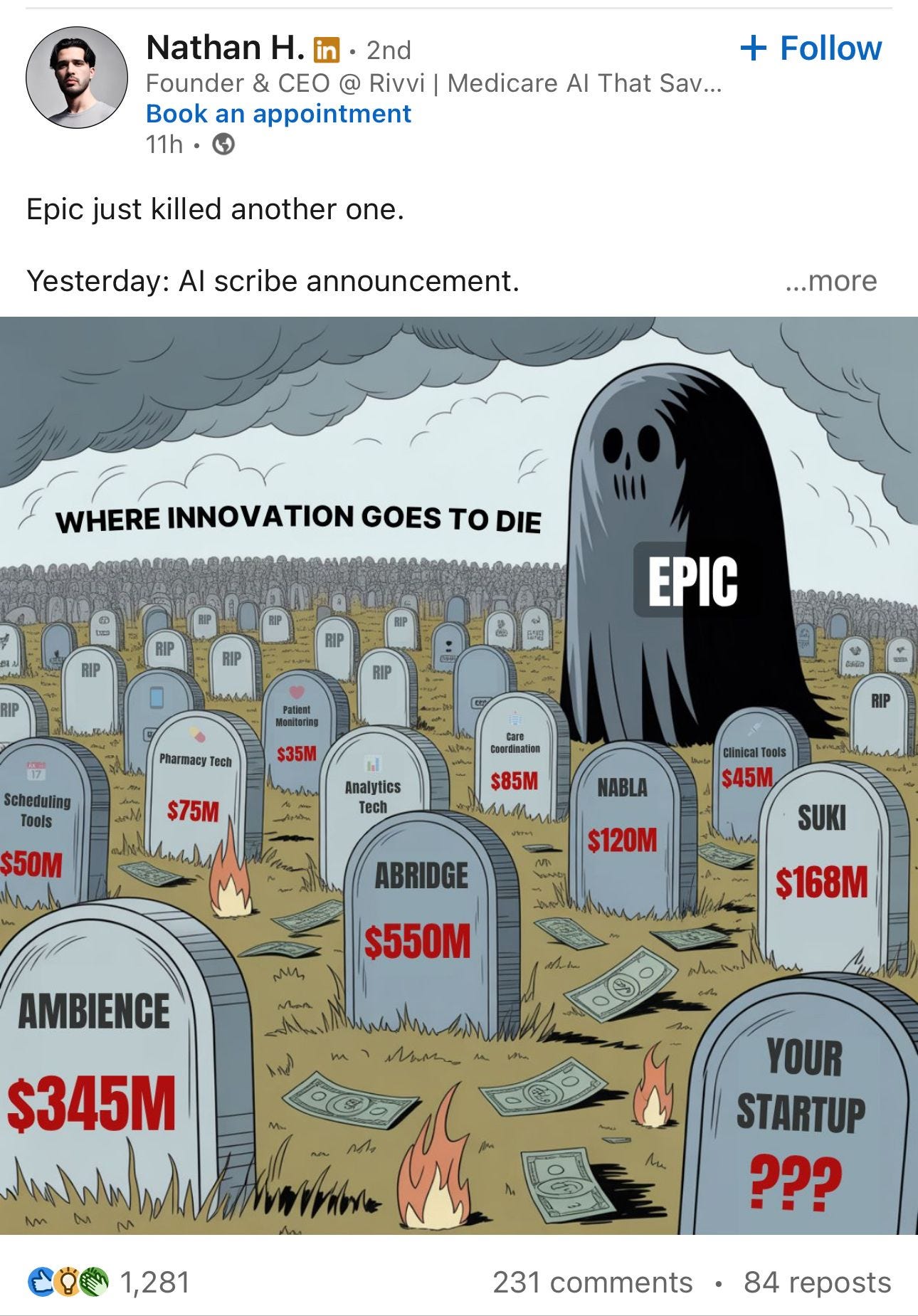 📝 Epic, used by nearly half of U.S. hospitals, enters the AI scribe race with plans to launch its own ambient note-taking tool