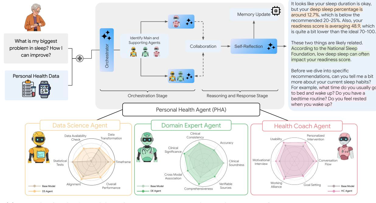 In a systems paper from Google Research, DeepMind & more introduced the Personal Health Agent (PHA), a multi-agent AI framework that integrates wearable & medical record data to provide personalised health insights. Built through a user-centred design using 1.3k real-world queries and expert workshops, the system combines three agents: a Data Science agent for time-series analysis, a Domain Expert for evidence-based interpretation, & a Health Coach for goal setting. Evaluated across ten benchmarks with >7k annotations and 1.1k human hours, PHA delivered consistent, contextual answers across wellness, fitness, & symptom queries.