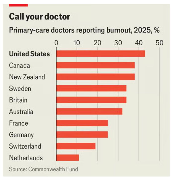 😩 American primary care doctors are among the world’s best paid, & the most burnt out, with 43% reporting exhaustion, the highest rate across comparable countries