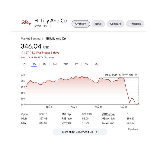 The real behemoth, who charges hundreds of dollars for a vial of insulin (and has faced lash back from it), making a reported US$28.3Bn in revenue in 2021 - saw its stock price plummet, a total of 4.37% at its worst - wiping US$15Bn in value from the Market Cap. In. A. Day.