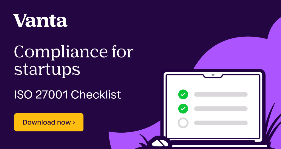 That’s where Vanta comes in. Our ISO 27001 checklist breaks down the process into clear steps, so you can spend less time on compliance & more time growing your business. Want your free compliance checklist?